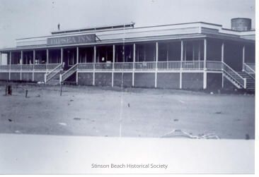 The photo is of a long, low building on the sand. There is a long veranda with stairs down to the beach at the right end and in the middle under a sign reading Dipsea Inn.Collection