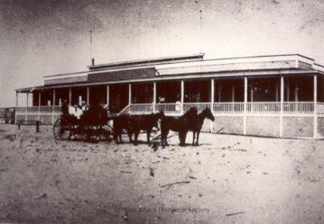 The photo shows the long low structure known as the Dipsea Inn with a horse drawn carriage (4 horses) on the sand in front of the building. There appear to be 4 people in the carriage and 2 people on the veranda of the inn.Collection
