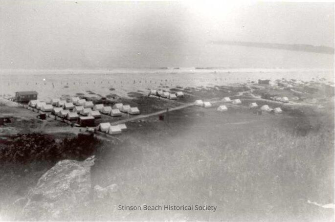 This is a photo of a tent encampment on Stinson Beach, taken from above. The foreground shows a large rock and some vegetation. At midground, 8 unpaved roads divide the campground with tents set up in straight rows plus several small structures. There is a log cabin on the far left, on Calle del Resaca, which belonged to Charles Lauff. The background shows the ocean and a row of pilings. This may be an original photo.Collection