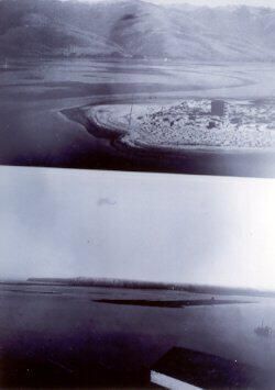 Panoramic photo of two views taken from overhead. One view shows the sand spit and Bolinas Lagoon, looking towards the Bolinas Ridge with living structure of "Holy Joe" who ferried people from the sandspit to Bolinas. The other photo shows Bolinas Bay looking towards Bolinas Pennisula.Collection