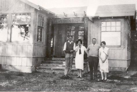 The photograph shows four people, two men and two women, standing in front of a cottage. There is a sign over the door saying TEA AND LUNCH ROOM.Collection