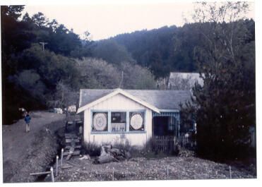 A photograph of a white cottage with 3 front windows, two of which have circular macrame hangings. To the left of the house is a road leading back toward the gulch and a person in a blue coat and light pants walking on it. The place, a tea house, was known as "The Lagoon" and later "The Pines".