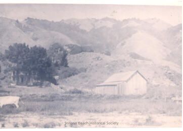 The picture is a rural scene showing the Easkoot house and barn. There is a white cow in the lower left foreground, hills in the background. The picture is very light.Collection