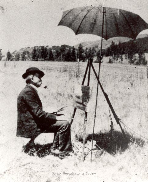 An original photograph of Thaddeus Welch with a paint brush in his hand and a pipe in his mouth, seated before his easel. He is sitting in a flat, grassy area with trees and hills surrounding him, somewhere on Mount Tamalpais. His painting is visible on the easel.Collection