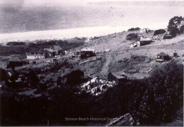 The photograph shows houses of Stinson Beach on the hill above the beach. Some houses are visible at beach level with the beach, Bolinas Bay and Bolinas Point in the background.Collection