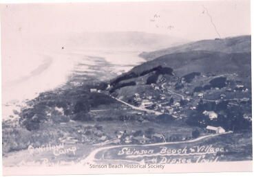 The Photograph shows the town of Stinson beach from highway 1 looking North. At the bottom of the picture is the junction of highway 1 and the Dipsea Trail. The photo has been written on in white ink. On the right (above/below the town) it says 'Stinson Beach Village' and 'Dipsea Trail' with an arrow pointing to the trail. On the left (above/below Willow Camp) it says 'Willow Camp' with an arrow pointing to it and 'auto road' with an arrow pointing to highway 1. In the background (very light) can be seen the beach itself and Bolinas Lagoon.Collection