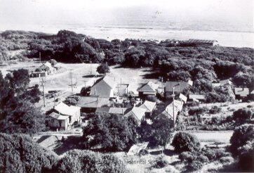 The photograph looks down on a cluster of buildings. There is a large white one at the center. At the upper portion of the picture the beach and ocean can be seen. There is a long low building at beach front on the right of the photo with small structures to the left of it.Collection