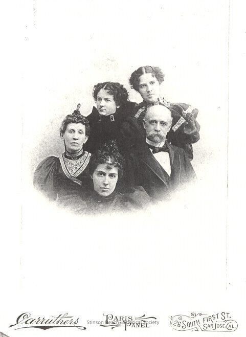 A photograph of four women and a man in late 1800s attire. They are grouped together, posed as a family with just the upper torsos showing. At the bottom of the panel are 3 stamps: Carruthers;Paris Panel; and 26 South First St. San Jose,Cal.