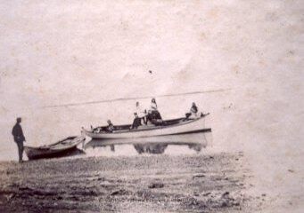 This is a photo of 2 small boats on Bolinas Lagoon with 6 unidentified people. The larger boat with 5 people sits a few yards off the sandy beach, its image reflected in the water. A man stands at the far left, holding on to the smaller boat. The larger skiff belongs to the McKinnons.Collection
