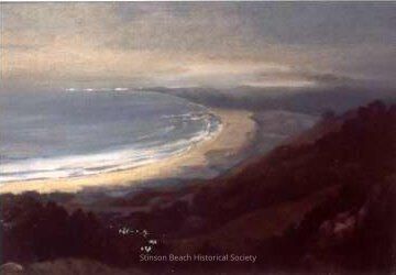 Photographic print in color of Bolinas Bay painted with the sun shining on the sand and surf from below heavy clouds. Duxbury reef is touched by the sun in the distance. It is a scene without structures. The shoulder of a hill fills the foreground.Collection