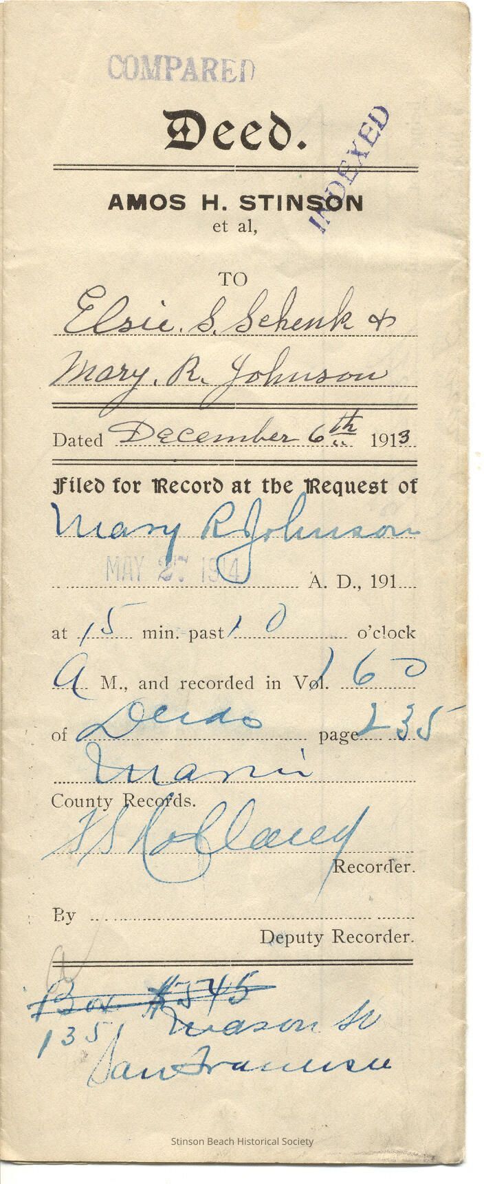 A deed transferring property from Amos H. Stinson to Elsie S Schenk and Mary R. Johnson. Property , Lot 9, Block 4 on Map of the N. H. Stinson Subdivision One, at Stinson Beach was purchased for 10 dollars (in gold coin)..Collection