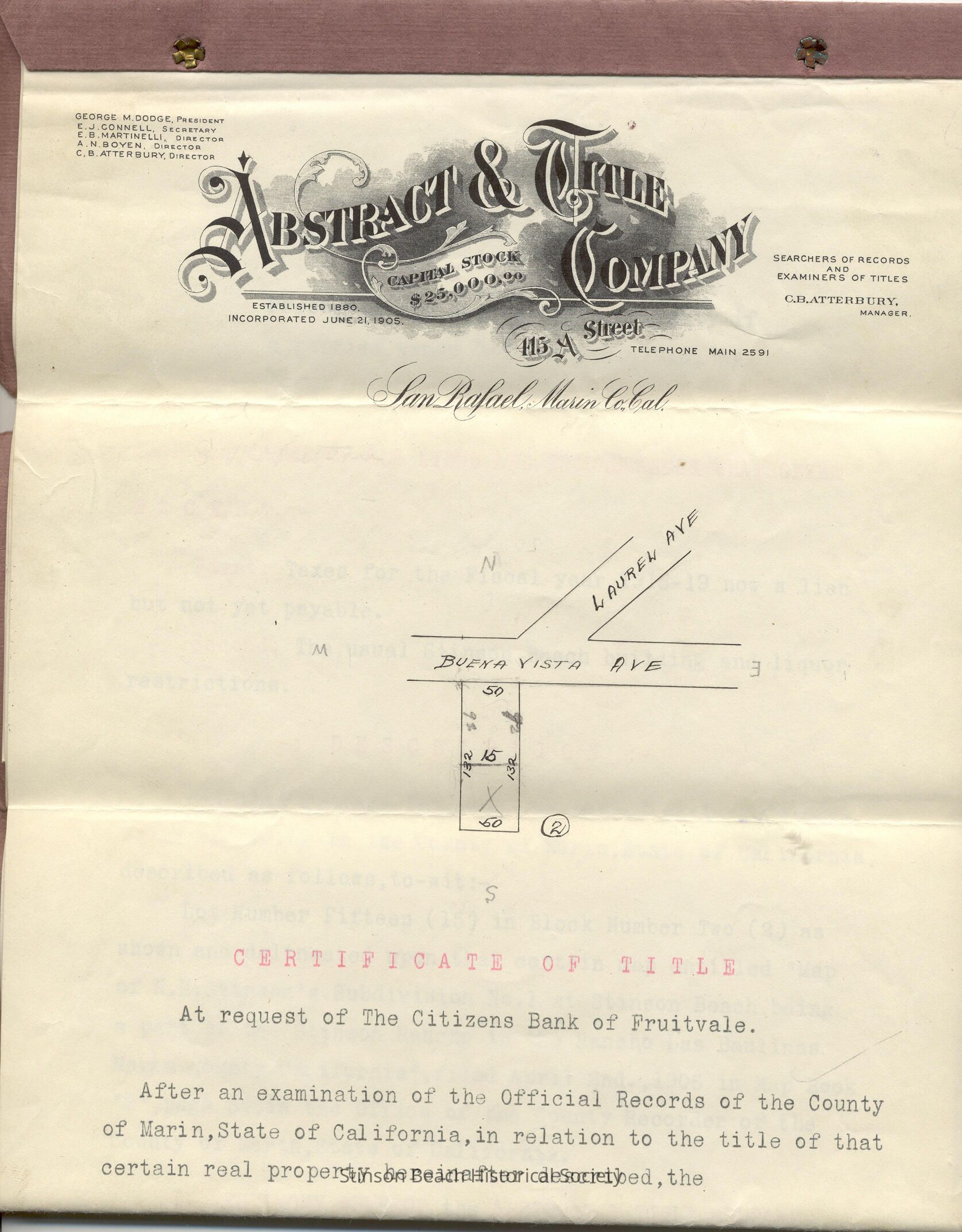 A certification by the Abstract And Title Company that the property described therein as Lot Number 15 in Block Number 2 delineated on " the Map of N. H. Subdivision One of Stinson Beach" is that of Mary F. deCamp.Collection