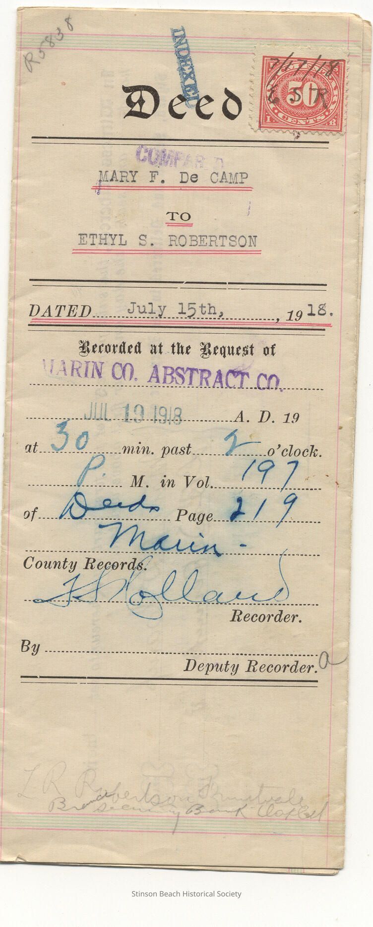 A deed transferring property from Mary F. DeCamp to Ethyl S. Robertson. Property: Lot number 15 in block number 2.Collection