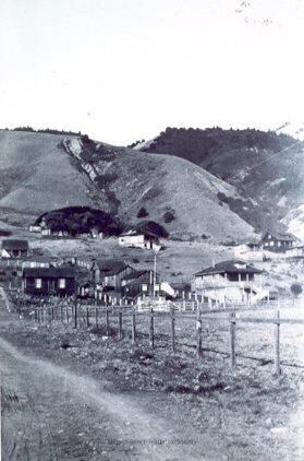 The photograph shows some houses nestled on the hillside with the coastal hills in the background and a fence in the foreground running diagonally across the picture with a dirt road in front of that. The three houses in the foreground are identified from left to right as the Haskill cottage, the Airey barn (with fencing around it) and the Sherman house.Collection