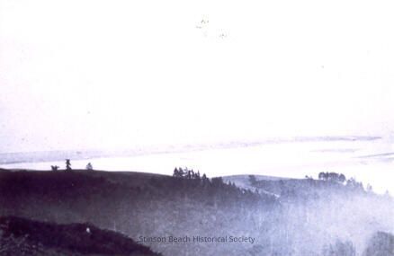 Photograph of Bolinas Lagoon taken from the mountain. Evergreen trees on the various ridges are silhouetted against the lighter background of the lagoon and sky. Photograph is blurry on the right side.Collection