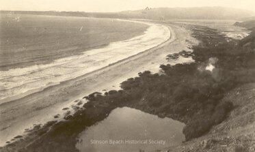 A curving beach and bay view with shrubs from line of breakers and extending up the slope of a hill. In the foreground is a small lake (Willow Camp Lake, aka "Poison Lake") . A spit of land shows at the upper right with an inlet from the sea at the curve of the bay in the distance. The top of the photograph shows distant hills.Collection