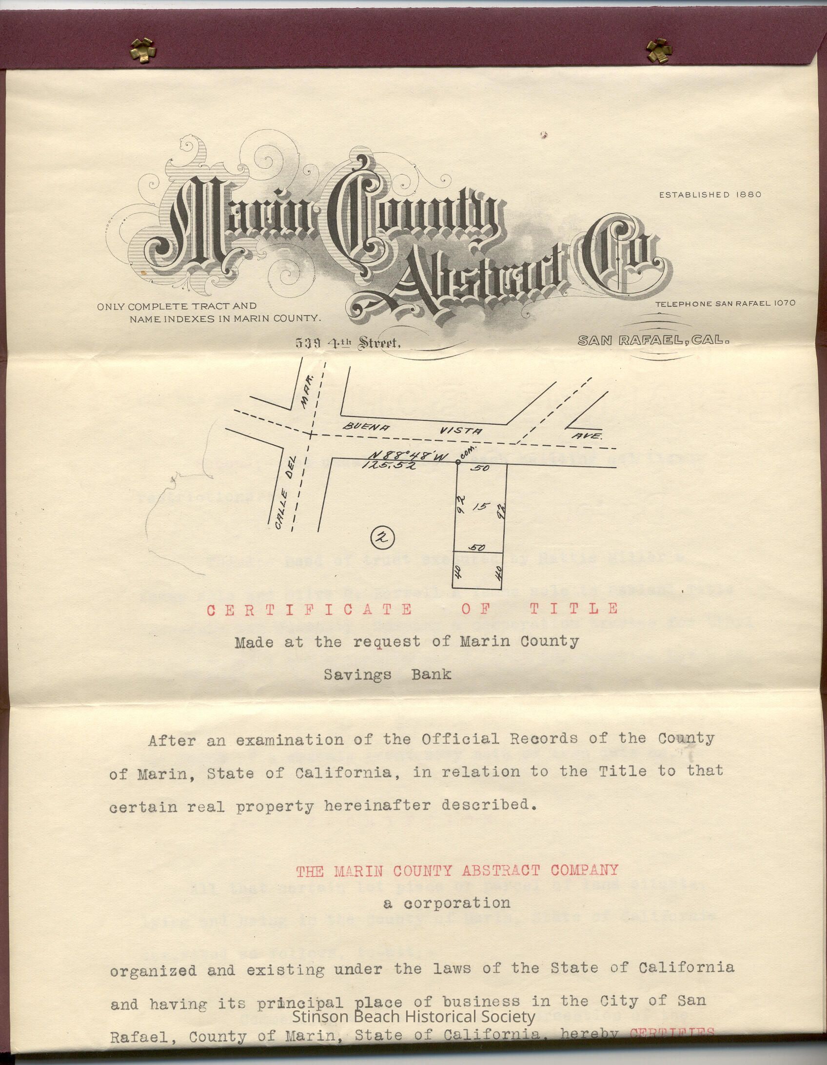 A certificate of title issued by the Marin Title Co. vesting title of the therein described real estate to Hattie Miller and Olive Burwell..Property: Lot no. 15, Block no. 2.Collection