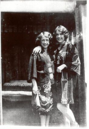 This is a picture of 2 young girls wearing Chinese patterned housecoats The taller of the two, on the right has her arm around the shoulder of the one on the left. They are smiling.Acquisition
