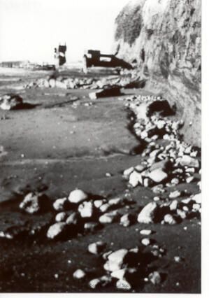 Cliff showing in upper right hand of photograph with a groin structure (wooden or concrete brace) to retard erosion. The erosion is seen in the sand of the protion of the beach showing in the foreground and the rest of the picture with many small rocks pushed up towards the cliff.Collection