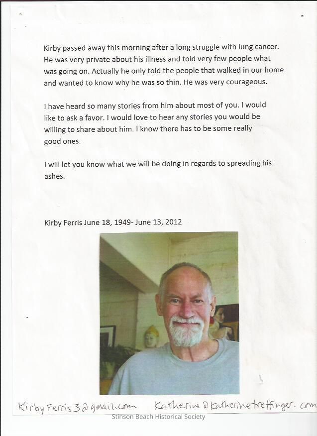 A flyer made to collect information on Kirby Ferris on his death. His friend, Katherine informs to the community at large about the death of Kirby and asks stories about Kirby the people might like to share. There is a photograph of bearded Kirby smiling in blue t-shirt attached to this flyer. At the bottom his and her e-mail addresses are handwritten.Collection