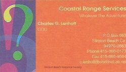 A colored calling card made for Coastal Range Services whose propriator, Charles Lenhoff, has lived in Stinson Beach since the 1970s. He is active in community matters. This calling card states "Whatever The Adventure!" as the description of his business.Collection