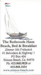 This is a calling card made for Redwoods Haus Bed and Breakfast. To go with its German name the card is subtitled in German, Zimmer Mit Fruhstuck. It states the address and telephone numbers and website address.Collection