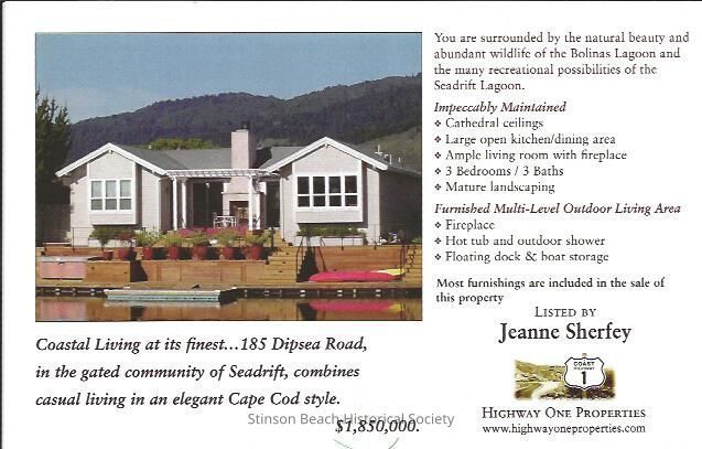 This is a postcard made by Highway One Properties. On the front is a picture of the house, it's deck and dock at 185 Dipsea Road. It's features are listed to the right of the picture. At the bottom is the price and the Highway One Properties logo and who it was listed by (Jeanne Sherfey).