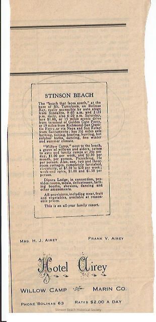 Reproduction of an old advertisement published in Coastal Post in 1980s. It has the reproduction of advertisement printed on the back of Dipsea Lodge's calling card on top and the reproduction of front of the Hotel Airey card under. The text of advertisement tells the available transportation (ferries and auto stages) to Willow Camp and the facilities available at the Dipsea Lodge and the price. The Hotel Airey calling card tells it is operated by Mrs. H. J. Airey and Frank V. Airey, located in Willow Camp, Marin Co., phone number (Bolinas 63) and the rate ($2/day).Collection