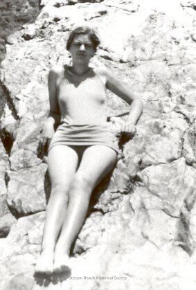 A young woman in a 1930ish bathing suit leans against a rocky ledge. Her dark hair is parted on the side; she frowns against the sun in her face.Collection