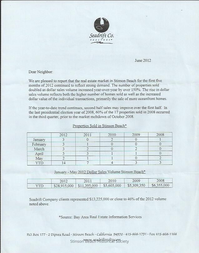 A letter bearing the Seadrift Co. logo to 'Dear Neighbor' with a summary of properties sold in Stinson Beach in the first 5 months of 2012. It features two charts: a chart of the number of properties sold January through May for the years 2008 through 2012 and a chart showing the Dollar Sales Volume for 2008 through 2012. The back has survey material in general about vacation homes and is signed by Katie Beacock. realty owner, and Hannah Crutcher, associate broker.Collection