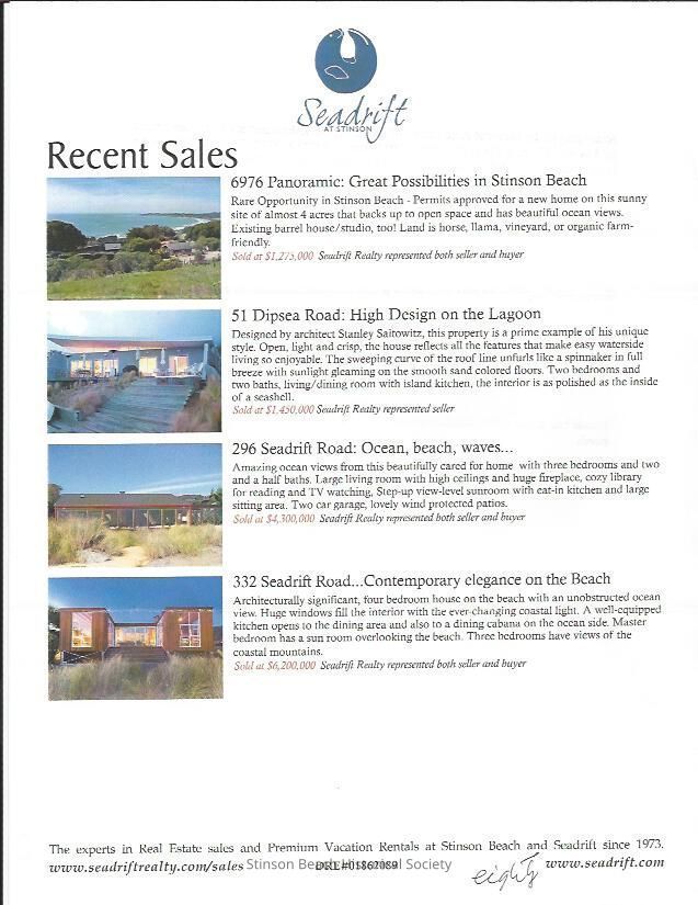 A flyer from Seadrift Realty labeled Recent Sales, with pictures of four properties (three houses and one lot) and their descriptions.Collection