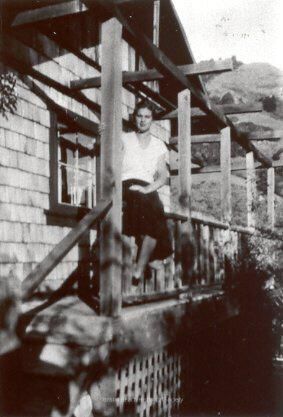 A photograph of a woman in a light blouse and dark skirt sitting on the porch railing of the Pepper House.Collection