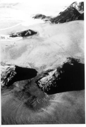 A photograph of rocks protruding from the sand with wave froth swirling among them.