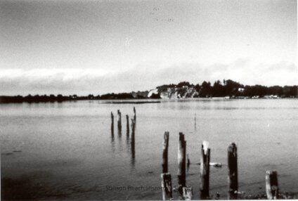 A photograph looking across the Bolinas Lagoon from Highway 1 towards Bolinas. There are remnants of pilings at Mc Kinnon's Landing going out into the water.Collection