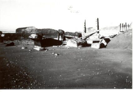 Sand and sky with storm damage on the sand, scattered with broken bits and slabs of a groin on Bolinas Beach. There are the uprights that had been erected to hold the cliff and some planks bolted to these for the same purpose. These are what is left after the forces of nature torn them apart.Collection