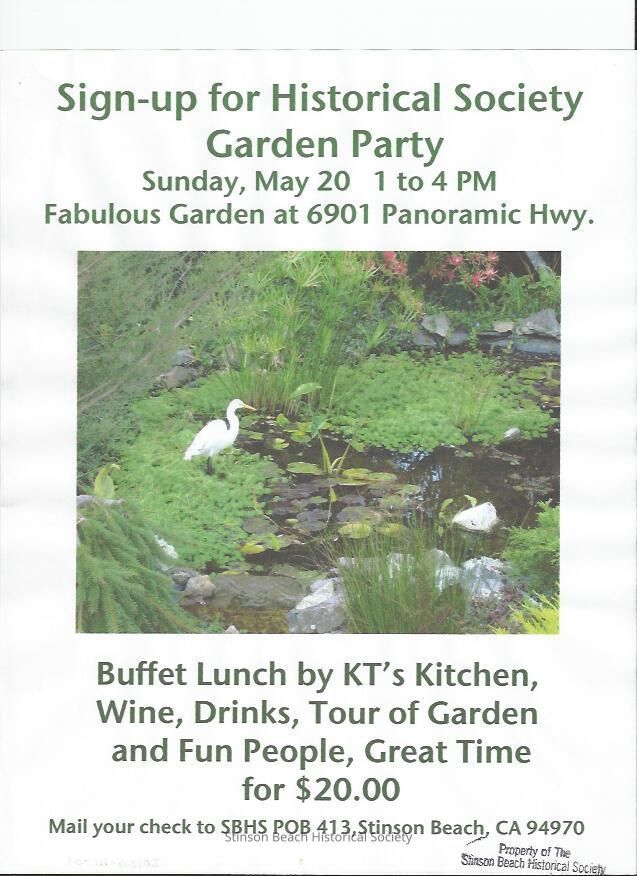 A colored Xerox print of a flyer made on the occasion of SBHS fundraising event in May 20, 2012. The Garden Party event took place in the garden of Martin Cline's residence at 6901 Panoramic Highway. Buffet lunch, cooked by KT's Kitchen, was provided with wine and soft drinks. Garden tour was provided by Martin Cline. The flyer shows a photo of the pond in the garden with a great egret. Water lilies, papyrus plants are visible among other vegetation. It asks people to sign up for the $20.00 occasion.Collection