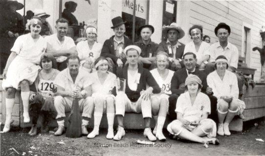 A group photograph of men and women sitting in front of Airey's store. Three of the women are wearing racing numbers. Dipsea women runners with their beaus.Collection