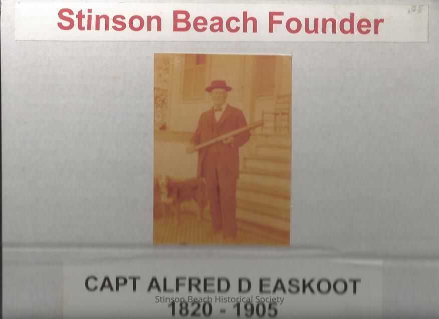 It is a faded photograph of Captain Alfred D. Easkoot mounted on a corrugated card board 12 x 11 7/8 in size. It has the title in red Stinson Beach Founder across the top of photograph and Capt Alfred d Easkoot 1820 -1905 in black on the bottom of his photograph with description; "Easkoot standing in front of his house at Easkoot Beach ( late Willow Camp/ Stinson Beach) about 1900. His left hand and forearm were deformed due to burns suffered in a ship fire, when he was child.