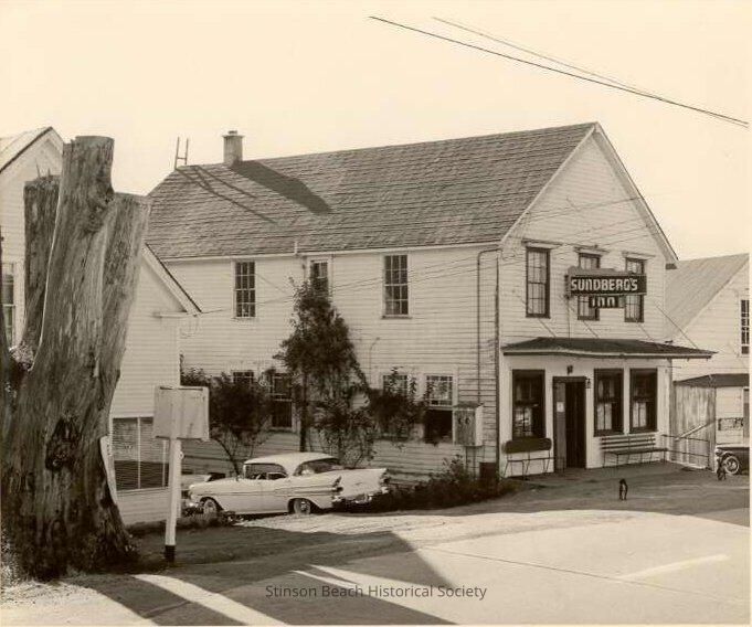 A photograph of the front and side of Sundberg's Inn (sign above the door) in Olema with a car parked beside the building in the space between the Inn and a neighboring house.Collection