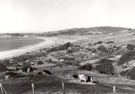 The photo is a panoramic view of Bolinas Bay, the beach and Bolinas Lagoon. The foreground is a hilltop with cattle feeding on piles of hay.Collection