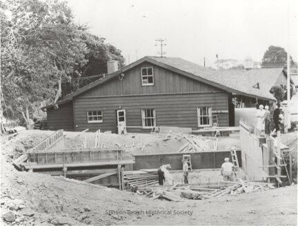 The photo shows the foundation for the church being laid in the ground. There are 3 workmen down in the hole and there are also people up at road level overlooking the work. The community center building can be seen behind the construction.Collection