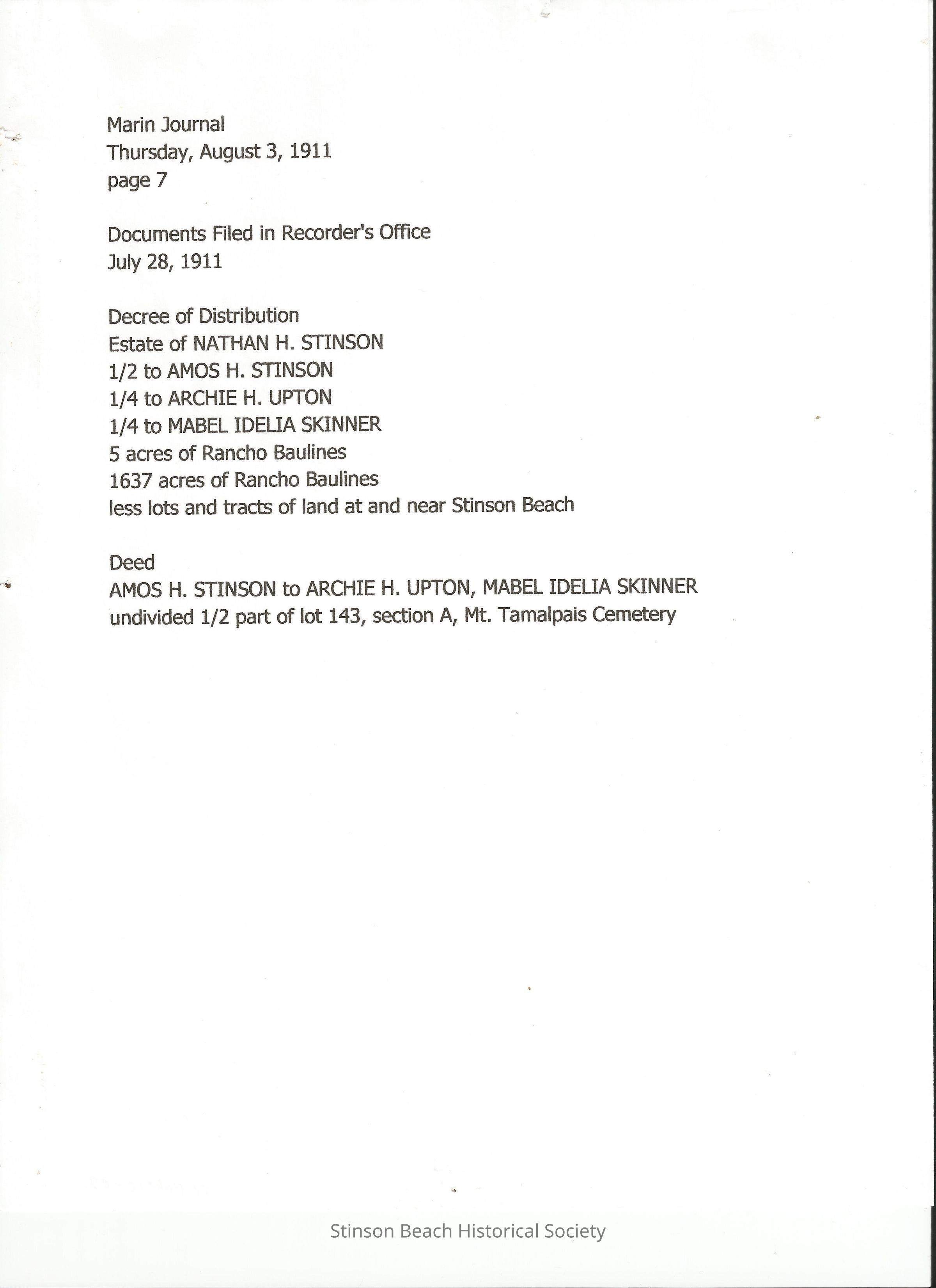 A copy of document filed in Recorder's Office on July 28, 1911, published in the Marin Journal on Dec. 31, 1925. It shows Nathan Stinson's will listing decree of distribution of his estate: 1/2 to Amos H. Stinson, 1/4 to Archie H. Upton (His stepson), and 1/4 to Mabel Idella Skinner (his stepdaughter).Collection
