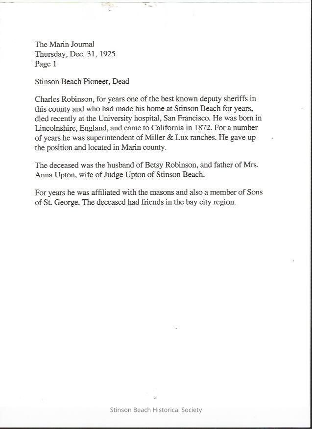 Copy of obit published by Marin Journal for Charles Robinson, Deputy Sheriff, who lived in Stinson Beach. He was the father of Anna Upton, wife of Judge Upton who donated Upton Beach and created the Charles Robinson Tract in his father-in-law's name.Collection