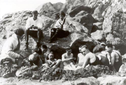 A photograph of 10 men and women in bathing suits sitting or laying in a bath scooped out of the sand. There are 3 people fully clothed sitting outside the bath. Sand is in the foreground, rocks in the background.Collection