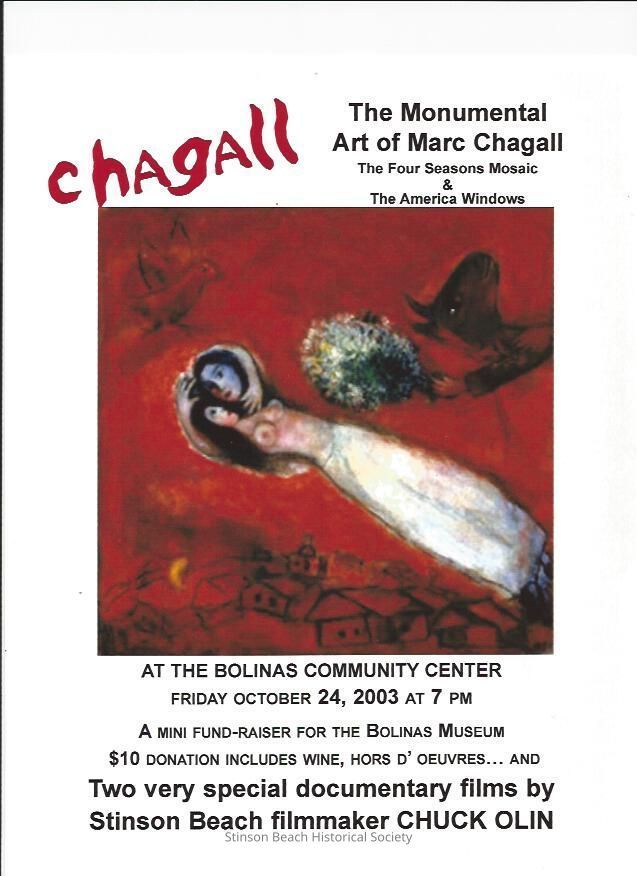 Poster poster made by Bolinas Museum for its mini Fundraising. The local filmmaker Chuck Olin's documentary, The Monumental Art of Marc Chagall, was shown at Bolinas Community Center on October 24, 2003.Collection