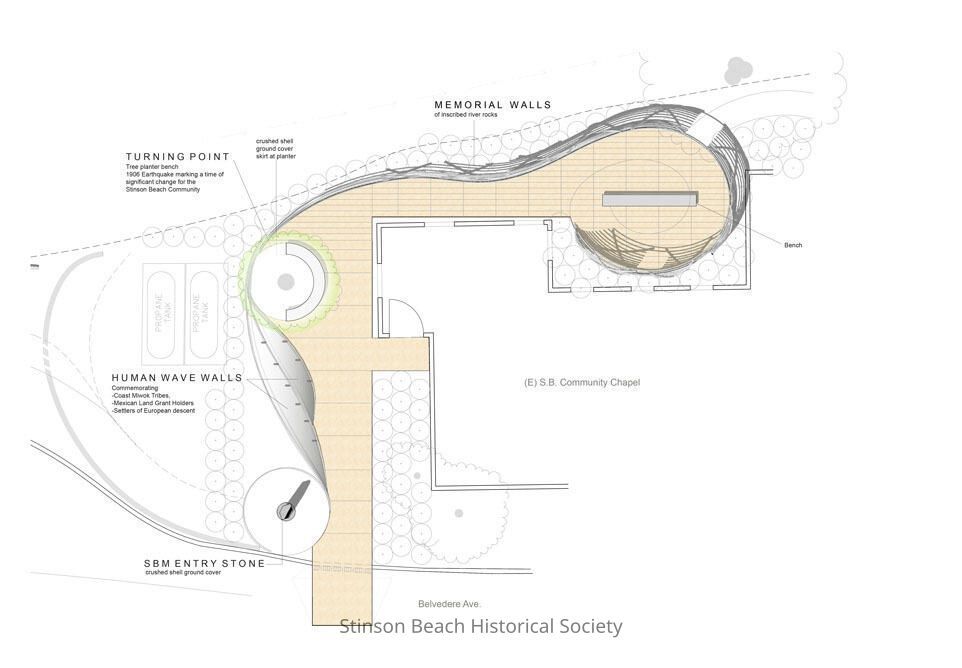 Rendered site plan of SB Memorial. Showing the locations of Paved Walk Way, Entry Name Stone, Human Wave Walls, Blossoming Tree and Turning Point, Memorial Trellis Walls and Bench.Collection