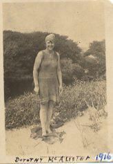 A photograph of a young woman in a bathing costume standing on a towel on the sand with grass and trees in the background. 'Dorothy Mc Alister 1916' is written in ink underneath the picture.Collection
