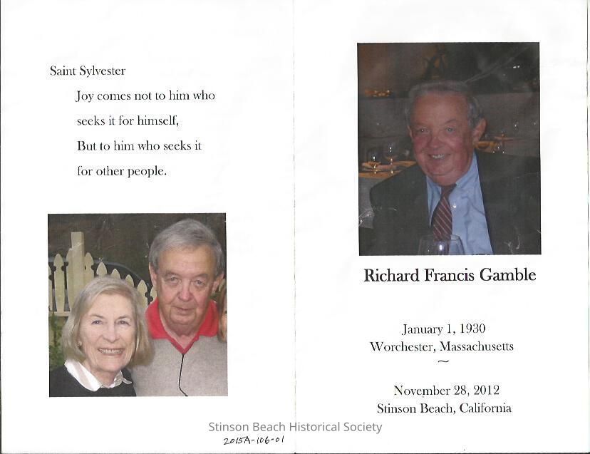 This is a funeral program for Richard Francis Gamble printed on a letter sized paper front and back and folded in half. It has colored photographs of Richard and his wife. THe funeral was held in Stinson Beach Community Chapel on Nov 28, 2012. Richard was a solid waste specialist engineer and his wife, Joan, had passed away 3, 4 years ahead. They resided in Seadrift.Collection