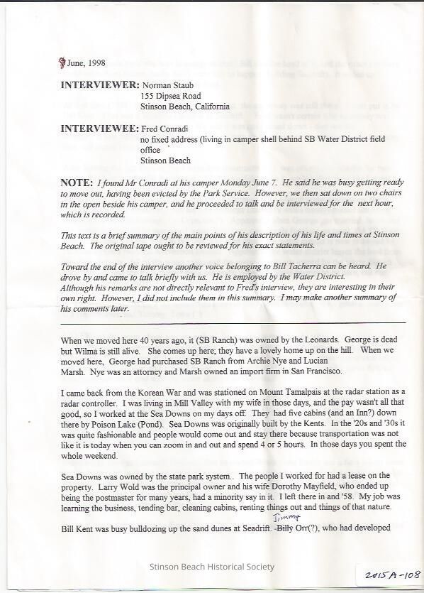 A brief transcription of the oral history of Fred Conradi by Norman Staub. This does not include Bill Tacherra Interview.Collection