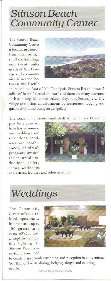 A flyer made for Stinson Beach Community Center rental purpose. It describes the location, hall and the accommodation details for wedding venue.Collection